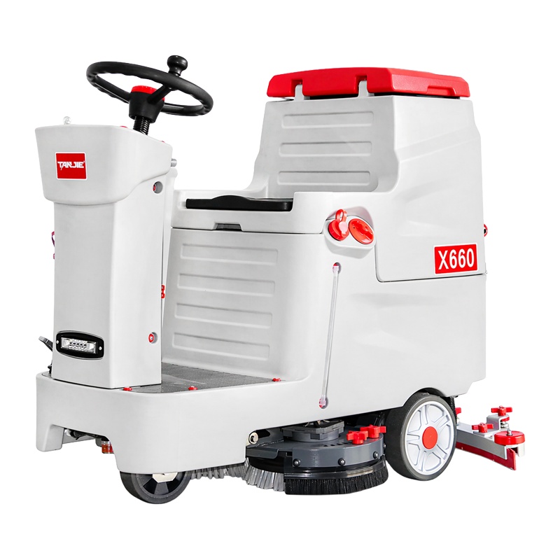坦洁驾驶式洗地机X660产品介绍一、产品概述​产品简介:坦洁驾驶式洗地机X660整机设计美观大气,操作简单易上手,一台机器可代替8-9人,适用于物业、医院、工厂、仓库、机场、车库等小面积室内场景地面清洁作业。产品定位:适用于中大型工厂、物流仓库、商场超市等大面积硬质地面清洁场景,满足企业对高效、深度清洁的需求。设计理念:秉持人性化设计理念,注重操作便捷
